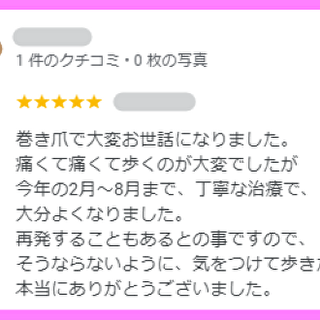 巻き爪で大変お世話になりました。 痛くて痛くて歩くのが大変でしたが今年の2月~8月まで、丁寧な治療で、大分よくなりました。 再発することもあるとの事ですので、そうならないように、気...