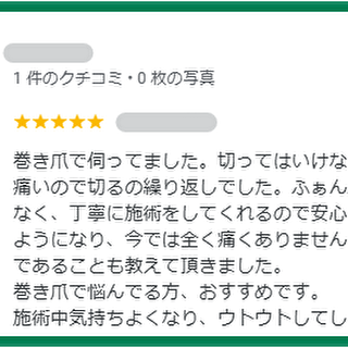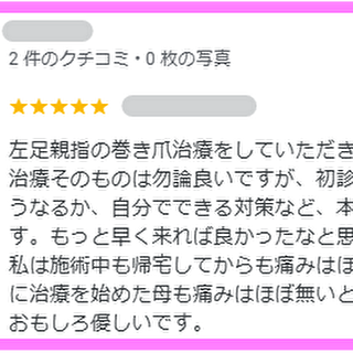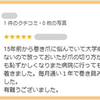 母が「巻き爪」のケアでお世話になっております。 病院では「手術をしないといけない」と言われ、とても悩んでいた母に 「一度行ってみたら?」と、こちらを勧めてみました。 まだ快復の途中...