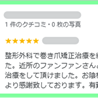 整形外科で巻き爪矯正治療を続けていましたが、改善が見られず別の診療所を探していました。 近所のファンファンさんと出会え、対応も良く好感が持て、とても親身になって診療、治療をして頂け...