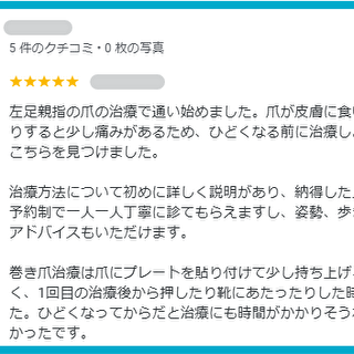 左足親指の巻き爪治療をしていただきました。 治療そのものは勿論良いですが、初診の説明で巻き爪になってしまう理由や放っておくとどうなるか、自分でできる対策など、本当に丁寧に説明してい...